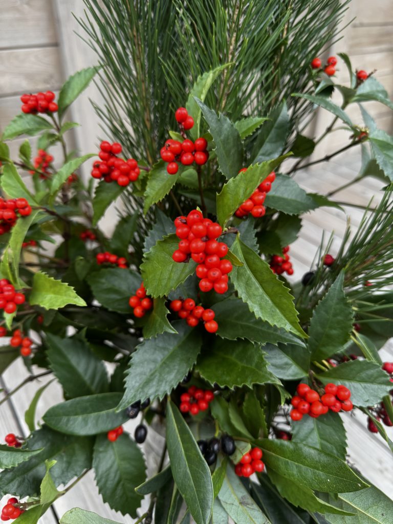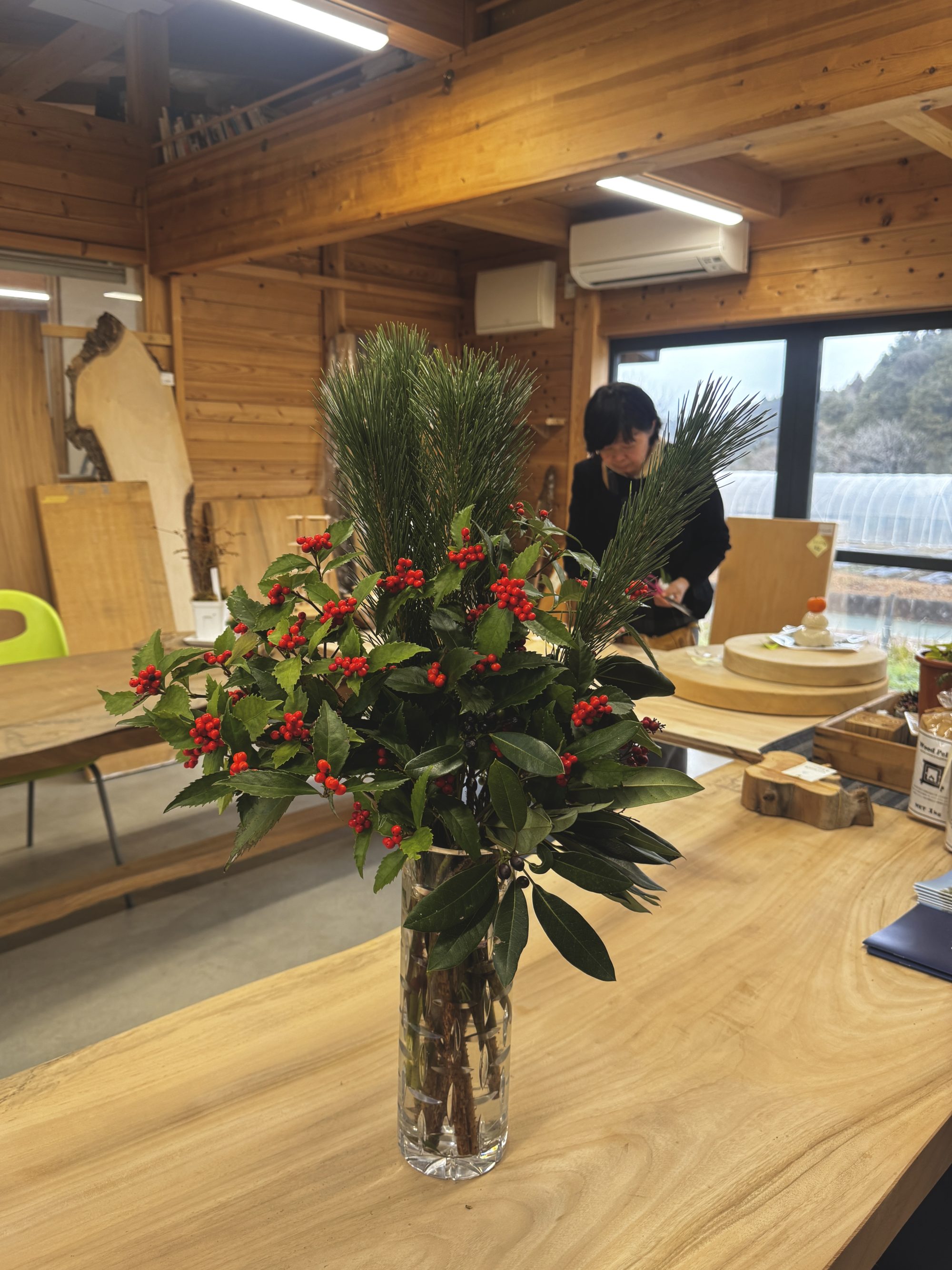 店内に一歩足を踏み入れると、お正月飾りとして生けたセンリョウと松が、心地よい新年の空気を運んでくれています。さらに、青々とした松の清々しい香りと、鮮やかな赤い実を眺めていると、「よし、今年も頑張ろう」と自然と気持ちが引き締まる思いです。